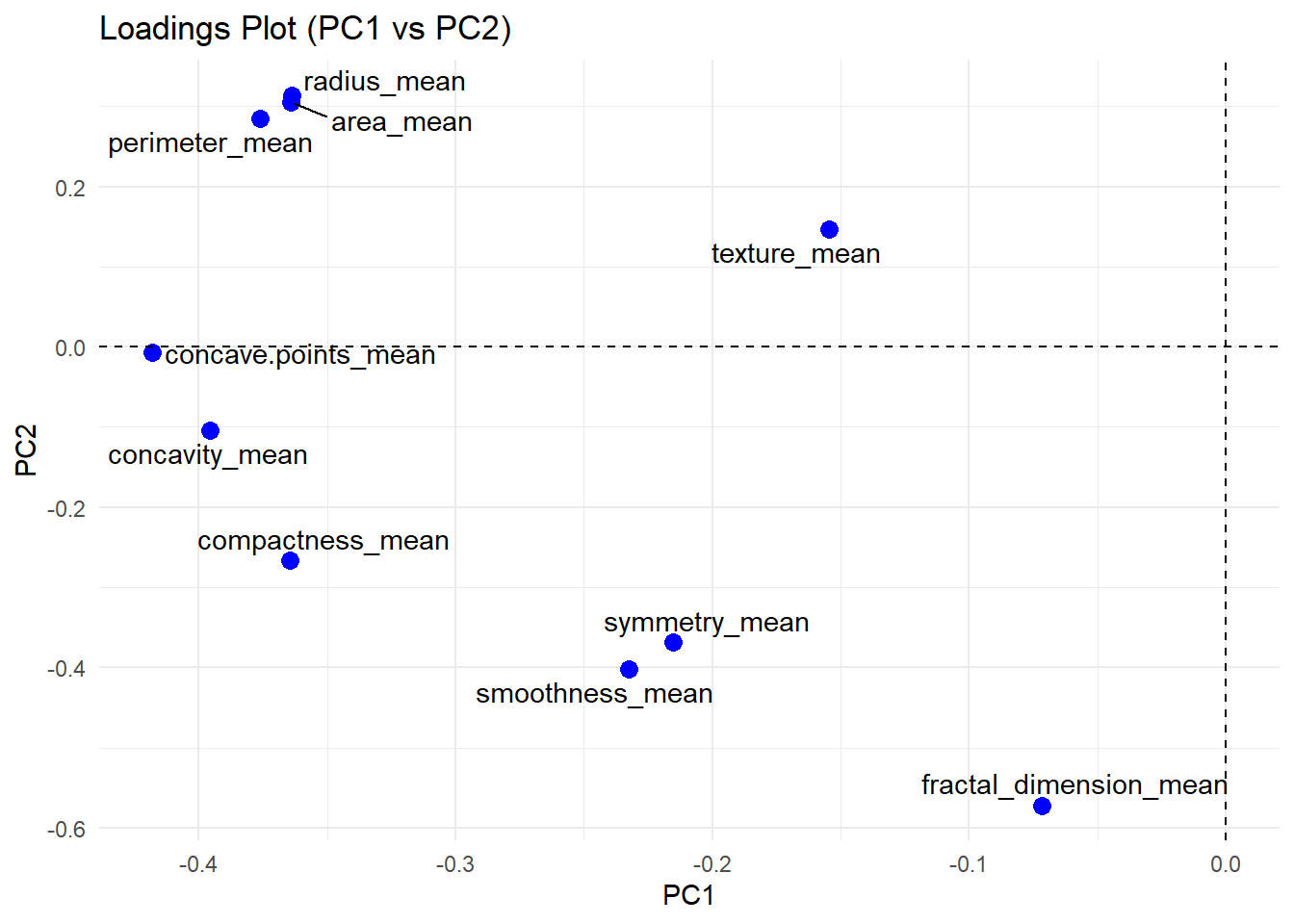 The Scatterplot Matrix illustrates the pairwise relationship between variables along the axis. Some variables shows strong positive correlations (e.g., perimeter, area and radius), while others exhibit negative correlations (e.g., perimeter and fractal dimension). These correlation patterns are further simplified in the PCA loading plot. Variables that are strongly correlated tend to cluster together (e.g., perimeter, area and radius), whereas uncorrelated variables are positioned farther apart.